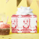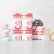 En röd och vit illustration av en turkisk kock som står framför en kött-rotisserie. Han har ett stort traditionellt knivar. En doner kabab-butik