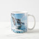 A coffee mug with an illustration of Door County, Wisconsin in the winter The pretty dune ledges covered in icicles and frozen blue ice, blue water of Lake Michigan hitting against the bluffs, Sun shining lighting up the sparkling snow and ice.