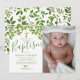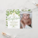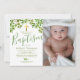 Könsneutrala dop-/dopinvitationer med en klassisk vit bakgrund som kan ändras till valfri färg, akvarellträdgrenar med frodig grön lövverk, ett religiöst guldkors, ett foto av ditt barn och en modern textmall som är enkel att anpassa.