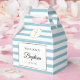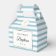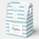 Med en söt blå-vit randig bakgrund har denna eleganta dop- eller dopfattningsförpackningslåda en elegant falsk guldprägling som ramar in dina evenemangsuppgifter i chic typografi och ett speciellt tackmeddelande på baksidan. Designad av Thisisnotme©