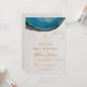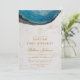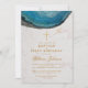 Denna eleganta inbjudan till dop och ettårsdag, som rekommenderas för en pojkes födelsedag/dop, har en stor blå agat-geod i den övre delen, ovanför texten. Bakgrunden är vit marmor.