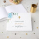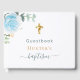 För en elegant dopceremoni för en babypojke. En chic vit bakgrund. Dekorerad med en akvarellmålad vit blomma (peony) och gröna eucalyptusblad, småkvistar, grönska, förgyllda blad. Ett förgyllt kors. Personifiera och lägg till barnets namn och datum. Gröna och gyllene bokstäver. Rygg: lägg till egen text: