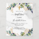 Marmor tryck som bakgrund dekorerad med eukalyptus grönska och gyllene blad. Ett gyllene kors. Anpassa och barnets namn och ceremonidetaljer.