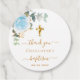 För en elegant dop, som firar en babypojke. En chic vit bakgrund. Dekorerad med en akvarellmålad ljusblå ros och gröna eukalyptusblad, kvistar, grönska, förgyllda blad. Ett förgyllt kors. Med texten: Tack och dop. Personlig och lägg till barnets namn och ett datum. Gyllene bokstäver.