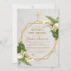 Denna eleganta blommiga geometriska dop- och förstafödelsedag-inbjudan som rekommenderas för en flicka har en oregelbunden förgylld ram med blomsterbuketter av vita callaliljor och ormbunke upp till höger och ner till vänster över två förgyllda hexagoner som överlappar varandra på en vit marmorerad bakgrund, med ett förgyllt kors högst upp. Barnets namn är skrivet med en elegant kalligrafisk skrift. All text har en guldfärgad färg, likt den förgyllda ramen.