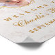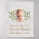 Denna botaniska geometriska dopdesign är könsneutral - kan användas för både pojkar och flickor. Den har ett utbytbart foton av barnet i en oregelbunden guldbildram bestående av två överlappande hexagoner med ett guldkors högst upp och gröna videblad till höger och vänster om ramen. Under ramen skrivs namnet och tillfället med en elegant kalligrafisk stil, resten med versaler. All text är guld. Bakgrunden är vit marmor.