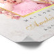 Det finns ett foton på en babyflicka i en imitation guld folie valv, med rosa orkidéer runt valvet. Ovanför det finns ett kors, också imitation guld folie. Under det är namnet och tillfället skrivet i en gyllene kalligrafisk stil, välkomstmeddelandet och datumet med små svarta versaler. Bakgrunden är vit marmor.