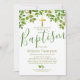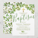 Könsneutrala dop-/dopinvitationer med en klassisk vit bakgrund som kan ändras till valfri färg, akvarellträdgrenar med frodig grön grönska, ett religiöst guldkors och en modern textmall som är lätt att anpassa.