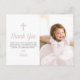 Tacka din familj och vänner för att de deltog i din lilla flickas dop med ett foto av ditt barn. Den rosa designen har vita prickar på en rosa akvarellbakgrund på baksidan av kortet. All text kan anpassas, inklusive ditt barns namn och meddelandet.