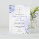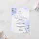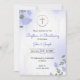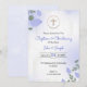 En dop- och dopinbjudan med blomsterarrangemang. Har ömtåliga lila och gröna blad, ett guldkors och text i elegant skrivstil.