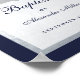 En enkel men modern dopdesign. På en marinblå rektangulär bakgrund finns en falsk silverfoliebåge som inuti har marinblå text på vit bakgrund. Ordet Dop och namnet är skrivna med en elegant kalligrafisk stil; den första raden är en välvd text.