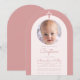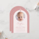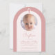En modern dopinbjudan för flickor. Inuti en dammig rosabåge finns en mycket ljus rosa, nästan vit båge med ett runt utrymme för foto och dammig rosa text inuti. Ovanför fotot finns ett dammigt rosenkors. Tillfället och namnet är skrivna med en handskriven skrift.
