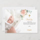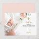 Ett modernt och elegant dop tackkort. En chic vit bakgrund dekorerad med akvarell-färgade rosa, roséguld blommor, eukalyptusgrönska och falska guldbrickor. Anpassa och lägg till ditt foto av barnet, tackmeddelande och namn.