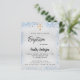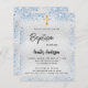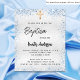 En modern, elegant dop, som firar en babypojke. Falskt silverfärgad bakgrund dekorerad med blå falska glittergnistor och ett gyllene kors. Personifiera och lägg till ett namn och festdetaljer. Svarta bokstäver.