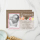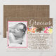 En Dop eller Första Kommunion tackkort med jutesläng och spets effekt bakgrund med ljusa vattenfärg blommor och utrymme för din lilla flickas foto.