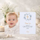 Ett modernt och elegant dopkort. En ljusblå bakgrund dekorerad med en akvarellmålad blå blomsterkrans, ett band och ett gyllene kors. Personifiera och lägg till ditt foto av barnet, tackmeddelande och namn.