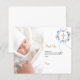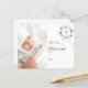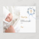 En modern och elegant dop tackkort. En chic vit bakgrund dekorerad med en akvarellmålad blå blomsterkrans, ett band och ett gyllene kors. Personifiera och lägg till ditt foto av barnet, tackmeddelande och namn.