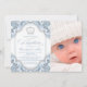 Dopinvitation för prins med vacker diamantkrona och elegant typsnitt på en bakgrund av virvlande babyblått och vitt. Denna eleganta dopinvitation för prins är lätt att anpassa för din fest genom att helt enkelt lägga till ditt foto och evenemangsinformation i önskad typsnitt, färg och formulering. Detta är en tryckt design utan äkta diamanter, glitter etc.