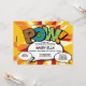En rolig, cool och trendig könsneutral serietidningsinspirerad dopningsinbjudan som ger en knall, smäll, pang åt din superhjältes firande event. Baksidan har ett matchande serietidningsprickmönster och pratbubbla för extra evenemangsinformation och adress. Designad av Thisisnotme©