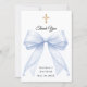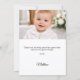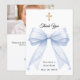 En modern och elegant dop, dopceremoni tackkort. En vit bakgrund, dekorerad med en stor blåfärgad slöja med pärlor och ett gyllene kors. På framsidan texten: Tack, namn och datum.