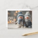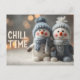 Den här charmerande och mysiga vinterscenen har två förtjusande snögubbe-dockor sitta på snö. De har blått och grått sticka och halsdukar och bilden överläggs med texten "CHILL TIME". Den mjuka fokusbakgrunden för varmt ljus skapar perfekt.