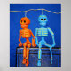 Två färgfulla kalacor eller esqueletos sitta på en mexikansk trälåda. Fira Day of the dead med detta levande par lerskelett på din vägg!