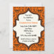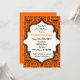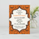 Döskallar fuskar orange svart mönster Halloween bröllop inbjudningskort för möhippan. Den här formella eleganten har en blommigt och skalle mönster och ett elfenben ram i mitten. Klassisk, men ändå contemporary med två typsnitt: en vintage och en coola. Elegant skokisk design, perfekt för Gothic- eller Halloween-fallbröllop.
