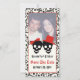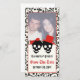 Elegant döskallar Halloween rött bröllop spara datum-fotokort med svart skallparbrid och stam på elfenbensbakgrund och skalle mönster gräns. Gumman bär en röd hatt och bruden en röd båge.