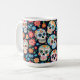 Färgade sockerhaltiga döskallar torkar genom färgade blommor på detta kaffe mugg för Dia de Los Muertos.