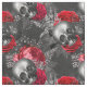 Den här vackra men grå designen visar grått och vita döskallar omgivna av röda blommor på mörkens grått-bakgrund.