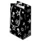 Skalle och crossbones med nätt snöflingor och stjärnor mot en svart bakgrund.
