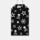 Skal och korsben med söt snöflingor och stjärnor mot svart bakgrund.