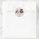De här elegant bröllop-klistermärkena har ett gotiskt Halloween-tema. Döskallar med sken och skum, tryckta i en vattenfärgskonstruktion, placeras i mitten. Den ena skallen bär top hat och den andra har lila blomsteraccenter som matchar blommorna i grund hörnen. Bakgrunden är en lätt, avbländad papper design. Uttrycket "Tills döden gör oss del" trycks överst i ett vackert manus med namn av paret och bröllop eller förlovningen tryckt nedan.