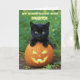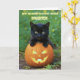 Happy halloween, dotter! Bild en söt liten svart kattunge med tassar vilande på en malande, fläckig Jack O'Lantern. Du får ett kort fyllt med tassar-underbara önskemål!