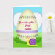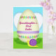 Denna gratulationskort har en vårscen med frodig grön gräsmatta under en klar blå himmel, centrerad runt en stor krämfärgad äggform som känns som fokus för en söt familjemoment 🌷. Ett mjukt lavendelband löper horisontellt över ägget, kantat av alternerande teal- och limefärgade diamantformer och små fuchsiafärgade blommor med soliga gula mittpunkter. Tvärs över mitten står magenta bokstäver som lyder ”Granddaughter’s First Easter”, placerade så att orden framträder tydligt mot den bleka bakgrunden. Nära den övre kurvan på ägget syns en svag hjärtform i en ljus ton, markerad med små prickade accenter som antyder ömhet. Längs den övre kanten vilar en liten snigel med varmt gul kropp, som ger scenen en lugn och vänlig sällskap 🐇. Snigelns antennspetsar är orange och dess ögon är slutna som om den njuter av dagen i