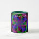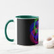 Modern 3D circular inspired geometric coffee mug with green handle. Unique features include a colorful double loop mesh styled center design, additional mug color options and text customization.