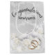 Parning av vita duvor och guld bröllop ringar på ett vitt smakmönster av satindamm. Text kan ändras eller tas bort.