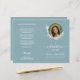 Moderna minnesprogram som är tryckt på ett pappert lakan viker du dig själv. Begravningsprogrammet visar din älskades foto inuti en handritad vit andedräkt på en blå bakgrund.