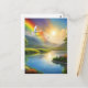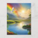 En bild av en duva som flyger över ett serenlandskap med regnbåge i himlar.