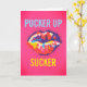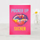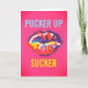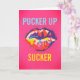 Glöm de klichéartade sonetterna och stormarknadens rosor. Om ert förhållande bygger på kvickhet och "lovely jubbly"-vibbar är detta kortet för dig. Med en livfull, popkonst-inspirerad läppskiss i högspänningsrosa och orange sätter framsidan tonen med ett fräckt "Pucker Up Sucker".