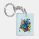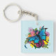 Blå och svart drake med fjäril vingar, som är kapslad mellan en bukett av färgstarka blommor i en ljusblå bakgrund