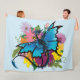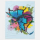 Svart och blå drake med blå butterfly vingar, kapslad bland en bukett av färgstarka blommor i en ljusblå bakgrund