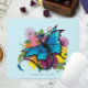 Blå och svart drake med fjärilfluga vingar kapslad i en bukett med färgstarka blommor i en ljusblå bakgrund.