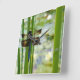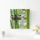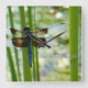 Det här vackra drakflygfotot togs på botaniska trädgårdar i Grand Junction, Colorado. Dronfly vilar på ett stort gräsklippsblad med förlängd vingar. Dess kropp är blå och dess genomskinliga vingar är mörk brun vid botten och vit på spetsen. Varje vinge har också ett litet svart rand överst kant mot toppen. Det finns flera blad av grönt gräs bakom drakflyget och bakgrunden till fotografiet är fullt av mousserande vatten som reflekterar sol.