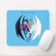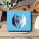 En lila drake och en vit drake i luft med keltisk rosa och rött hjärta mellan dem i en blå bakgrund