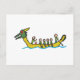 Drakbåtsdesign med drakhuvud och svans, en trummis som håller takten, fyra paddlare och en navigatör vid aktern. Rolig grafik för drakbåtstävlingar och fans.