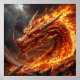 Ett vilt, serpentinliknande drakar omsluts av flammor. Dess fjäll är intrikat detaljerade och visar en blandning av djupa röda och eldorange nyanser som antyder intensiv hetta. Drakens vilda ögon lyser klart och fångar en känsla av kraft och hotfullhet. Rök och glödande aska virvlar runt det och bidrar till en övergripande atmosfär av kaos och intensitet. Bakgrunden visar mörka, stormiga moln som ytterligare förstärker den dramatiska effekten. Denna formidabla varelse tycks framträda ur ett eldsprutat landskap och ger ett intryck av dominans och råstyrka.