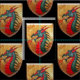 Det Linda Baysinger hack målning av en grönt som är medeltida, europédrake, på guld- färg, skyddar, med svart bakgrund. Avbilda det ©Linda Baysinger hack som all rättigheter reserverade