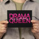 Här är perfektens kort för att fira dem som är lite "överst" på sin speciella dag! På födelsedagskortet visas texten "drama drottning" från glitter i den tjocka "teatern" med vit "grattis på födelsedagen" övertäckning