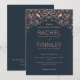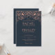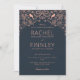 En mörk, marinblå bröllopsinbjudan med korall- eller roséguldmotiv, invecklad filigran och botaniska mönster skapar en sofistikerad design, midnatts trädgård.
